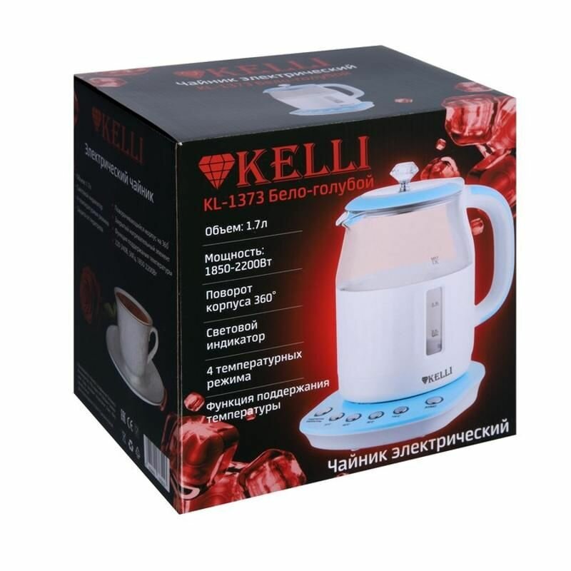 Чайник электрический KELLI KL-1373, стекло, 1.7 л, 2200 Вт, бело-голубой