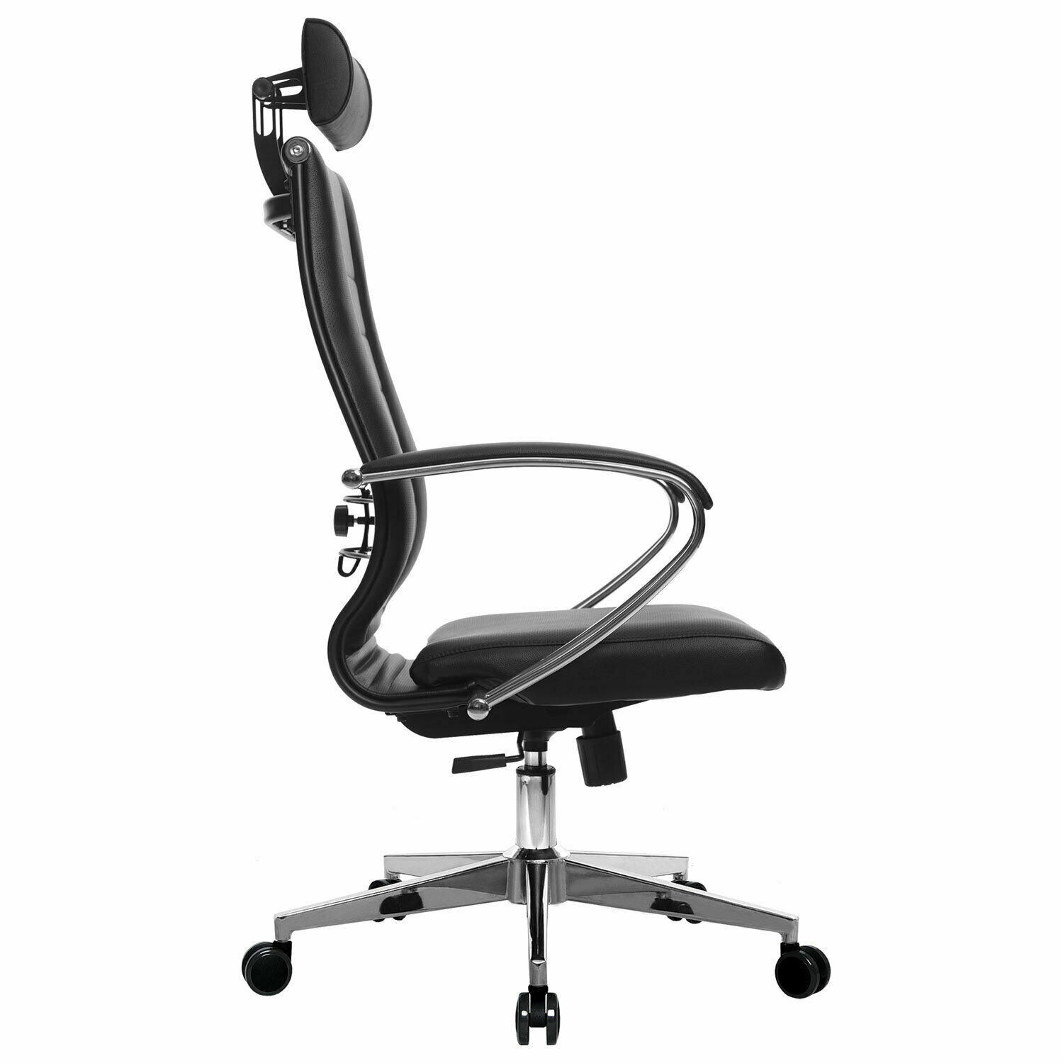 Кресло офисное метта "К-32" хром, рецик. кожа, подголовник, сиденье и спинка мягкие, черное