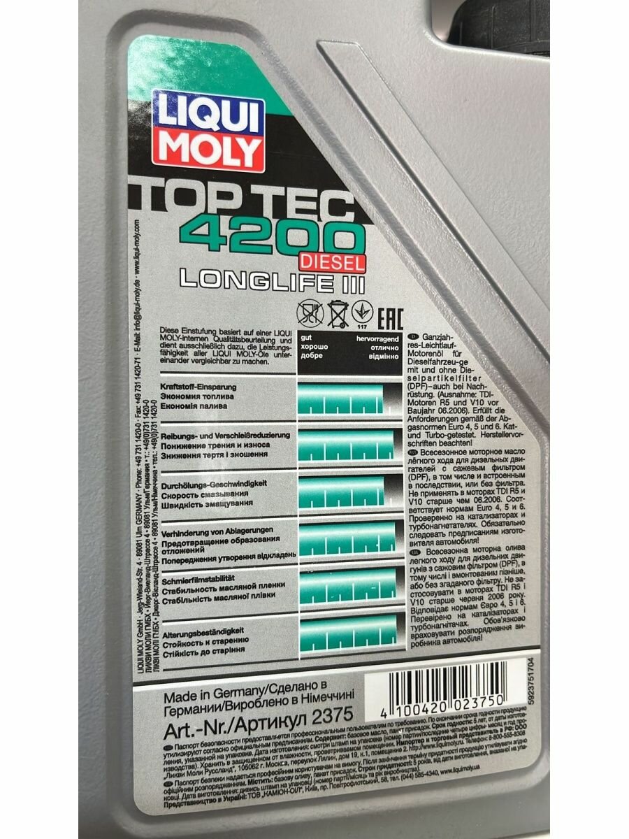 Liqui moly 2376 Liquimoly Масло Моторное Top Tec 4200 Diesel 5w-30 C3 (5л) 2376, Шт