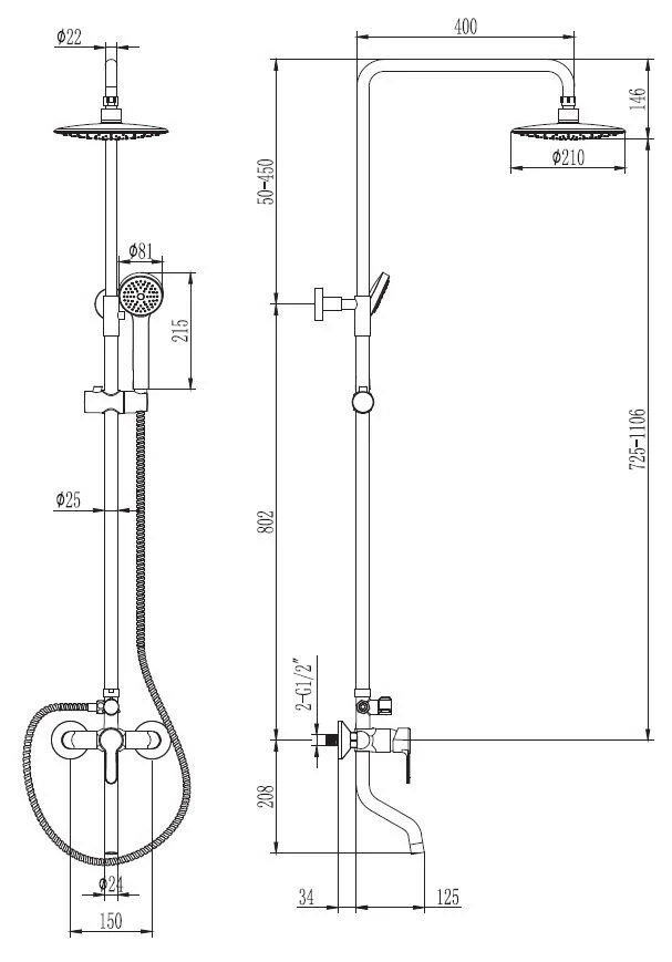 Душевая система 35k 800-1150мм "Тропический дождь"+лейка 1 реж. D81мм VODA VST2000