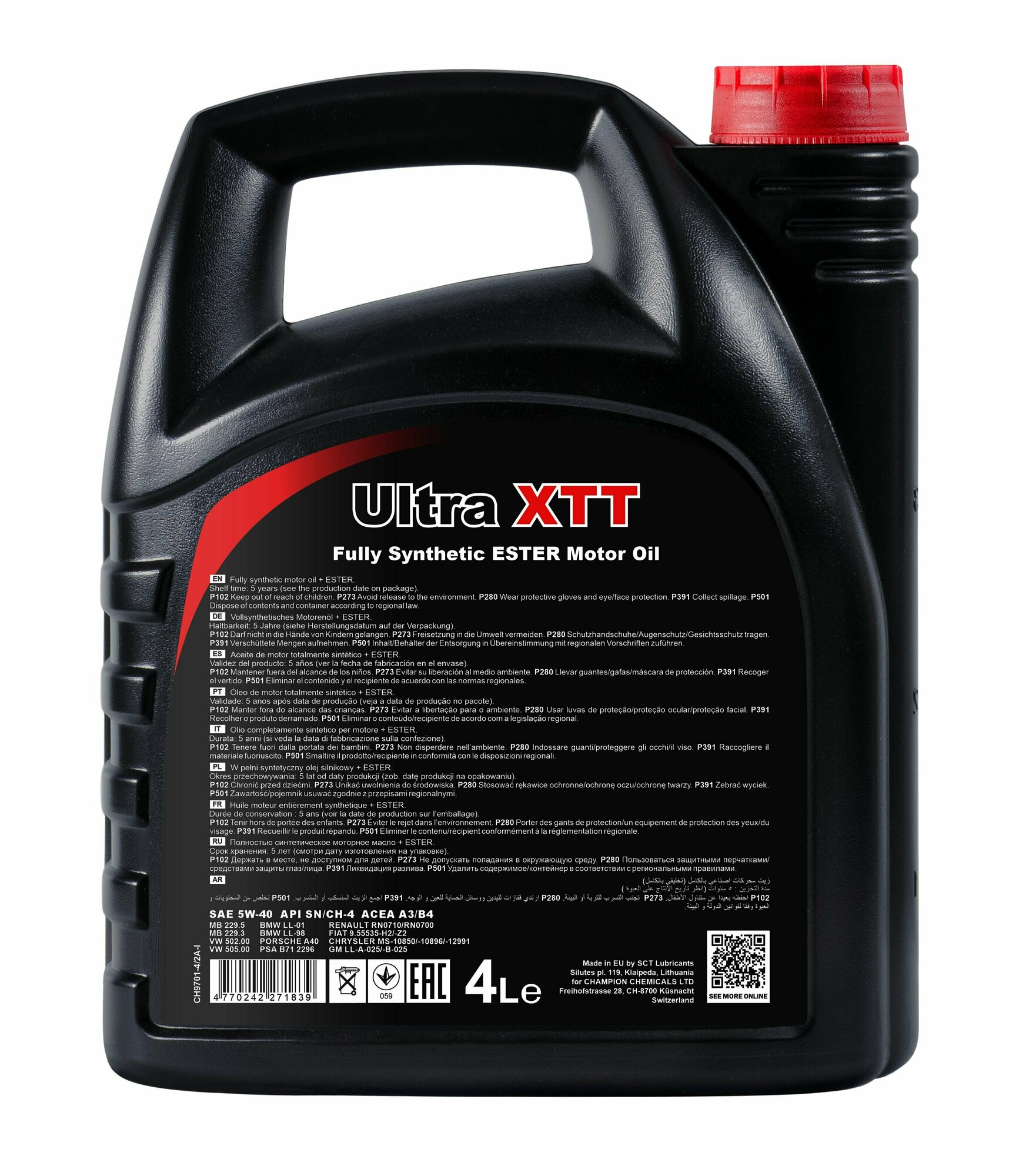 Масло CHEMPIOIL Ultra XTT SAE 5W-40 синт. (4 л) API SN/CF; ACEA A3/B4;VW 502 00/505 00; MB 229.3/226.5;PORSCHE A40 ; OPEL GM LL-B-025;RENAULT RN 0710/