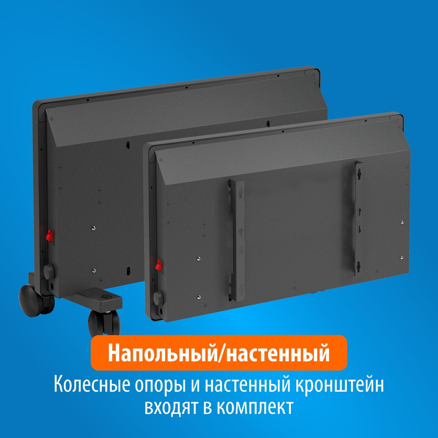 Мы конвектор поставили на ножки (легко прикрутить без дополнительных инструментов), но в комплекте еще идет стеновой кронштейн. Симпатичный недорогой и достаточно мощный обогреватель. |