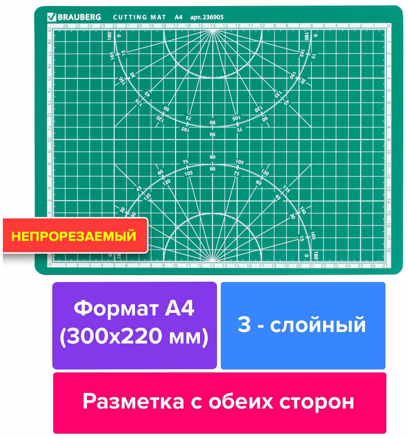 Коврик (мат) для резки BRAUBERG, 3-слойный, А4 (300х220 мм), двусторонний, толщина 3 мм, зеленый, 236905 В комплекте: 1шт.
