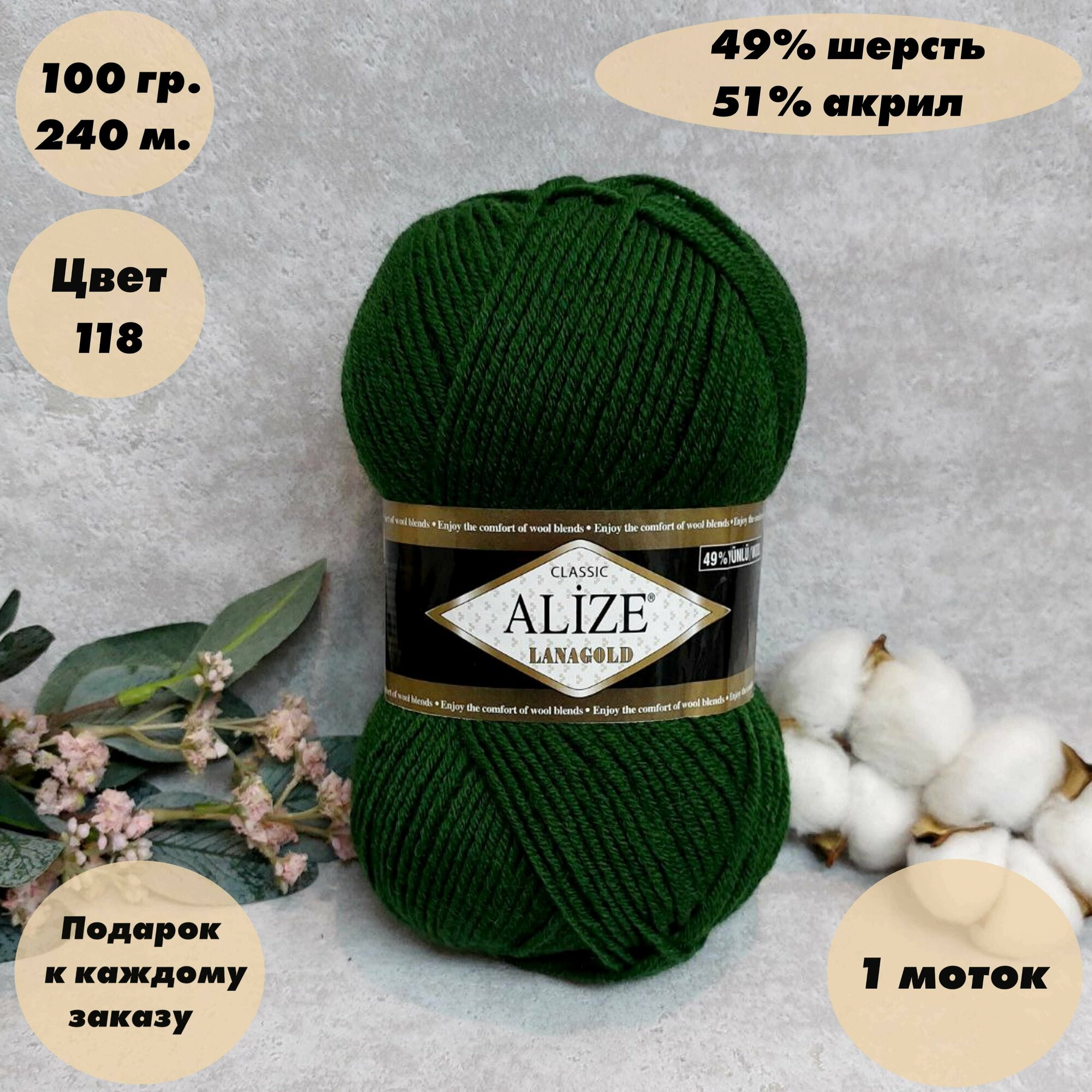 Пряжа для вязания Alize Lanagold (Ализе ланаголд) 1 моток, Цвет: Зеленый (118), 49% шерсть 51% акрил, 100 г 240 м