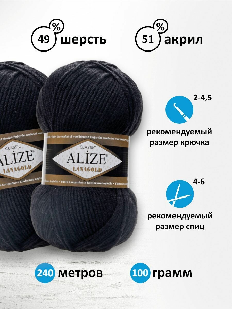 СохранитьПряжа Alize Lanagold (Ализе Ланаголд) - 5 мотков 60 черный 49% шерсть, 51% акрил 240м/100г интересное: