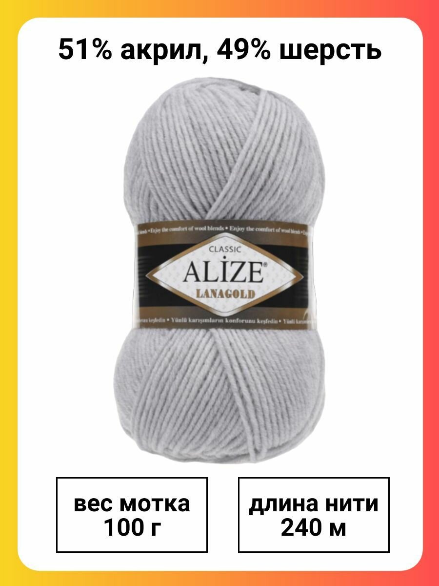 Пряжа ALIZE "Lanagold", 51% акрил, 49% шерсть, 240 м*100 г, 200 светло-серая