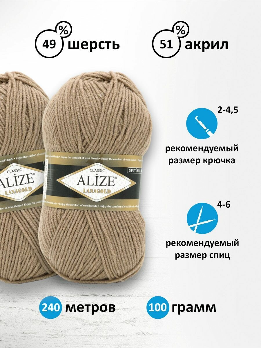 Пряжа Alize Lanagold Темно-бежевый (466) 2 мотка 100 г/240 м (49% шерсть, 51% акрил) ализе ланаголд