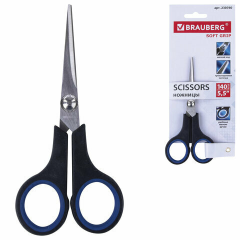 Ножницы BRAUBERG "Soft Grip", 140 мм, черно-синие, резиновые вставки, 3-х сторонняя заточка, 230760 (цена за 1 ед.товара)