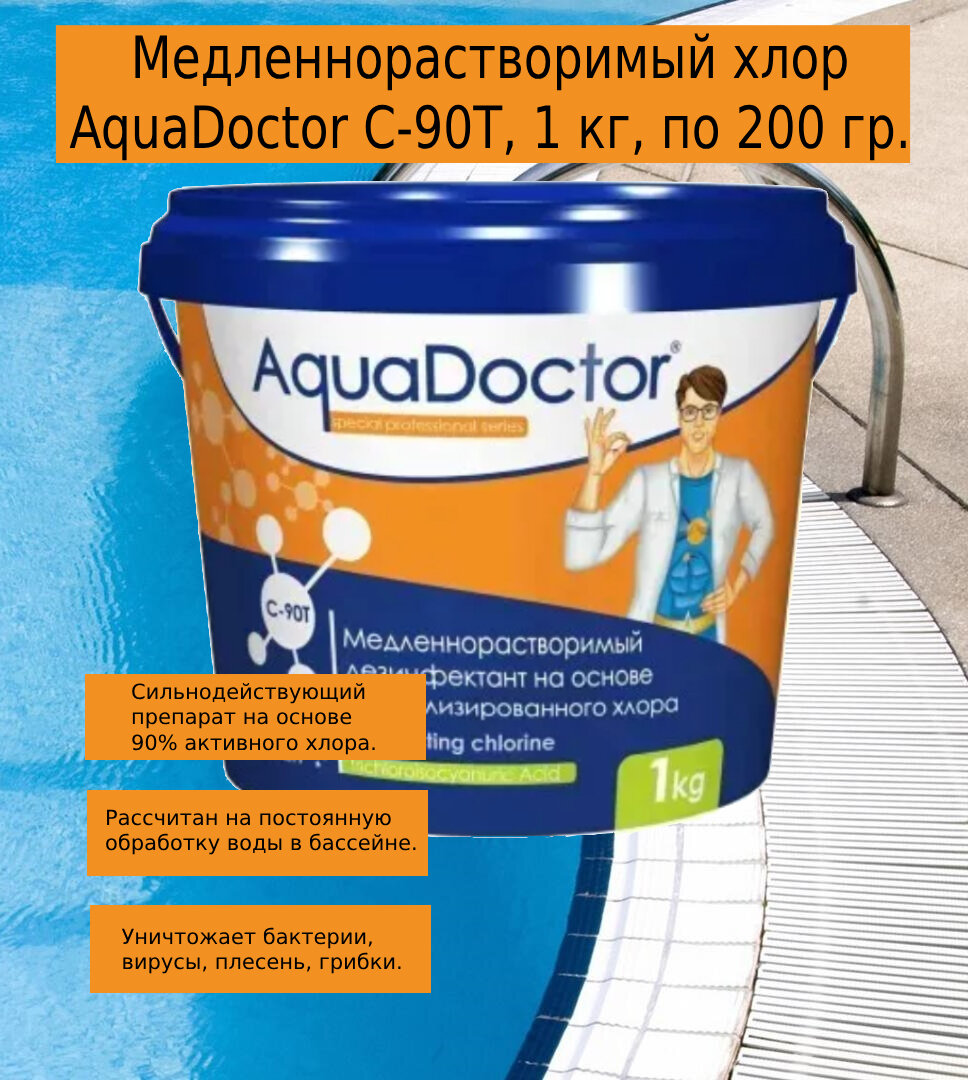 AquaDoctor, хлор, 1кг ведро, табл.200гр, медленнорастворимый, на основе 90% активного хлора (C-90T/1KG), уп.1