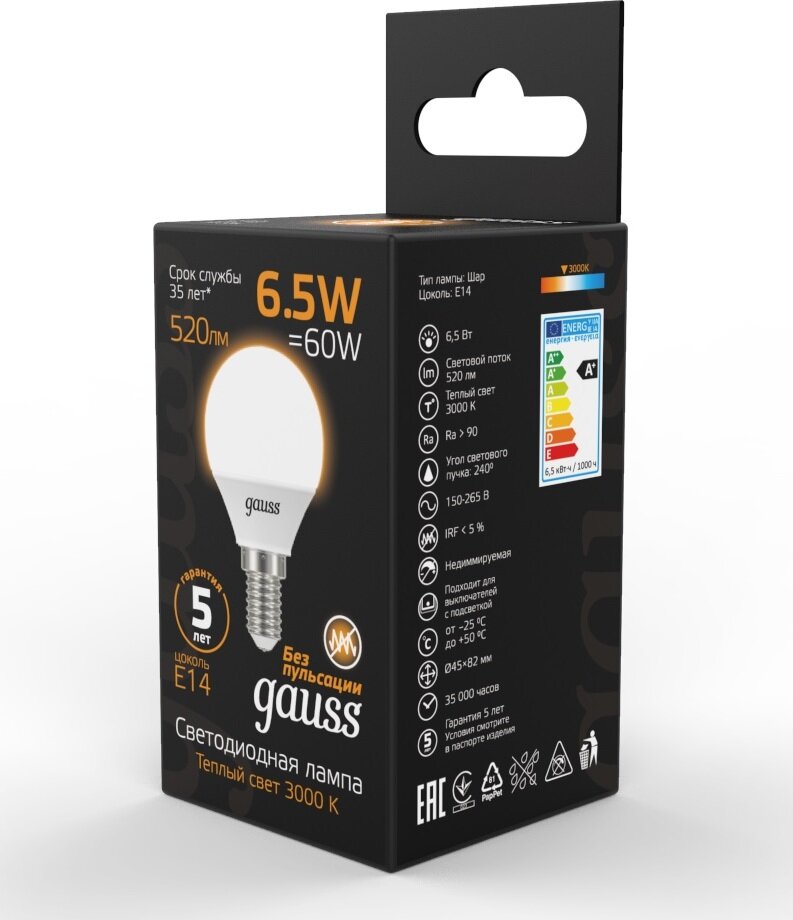 Лампа светодиодная Gauss 105101107 6.5Вт цоколь: E14 шар 220B 3000K цвет свечения белый теплый (упаковка: 10 штук) интересное: