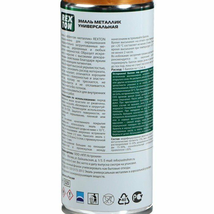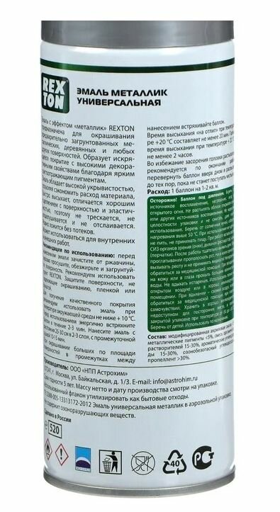 Эмаль металлик универсальная, алюминий, аэрозоль 520 мл REXTON RT130.00, RT13000 REXTON RT130.00
