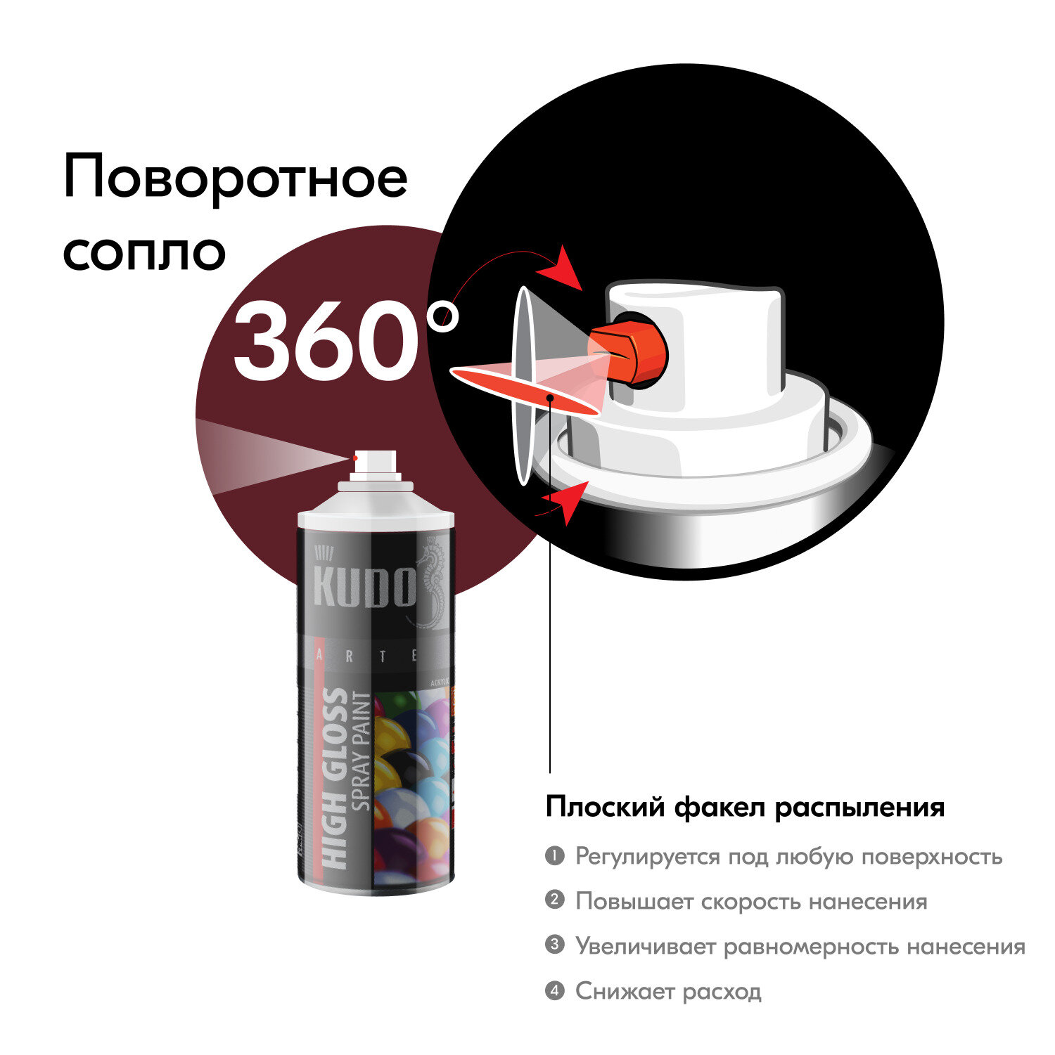 Аэрозольная акриловая краска Kudo KU-A3020, глянцевая, 520 мл, красная