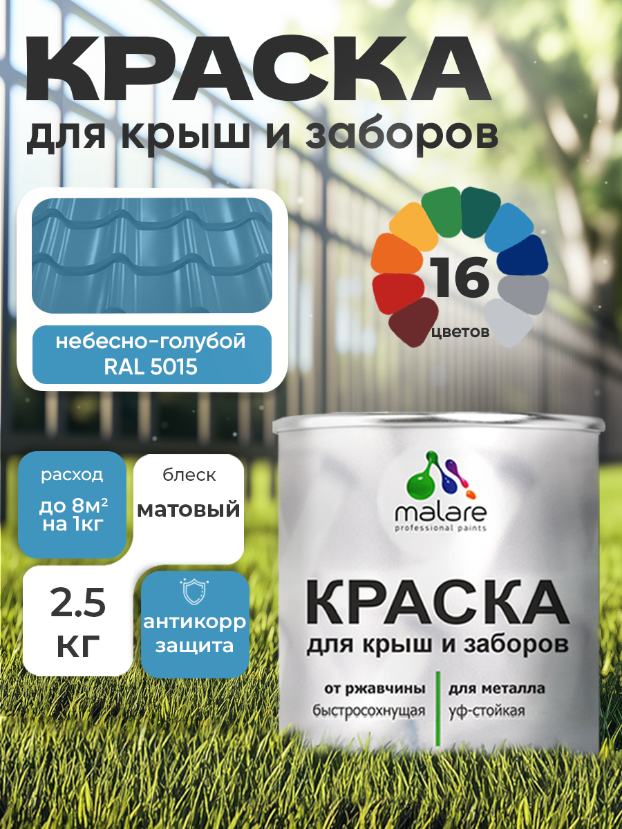 Купить Краска Malare для металлического забора, для крыши из металла, для металлочерепицы, антикоррозионная, матовый, небесно-голубой, 2,5 кг.