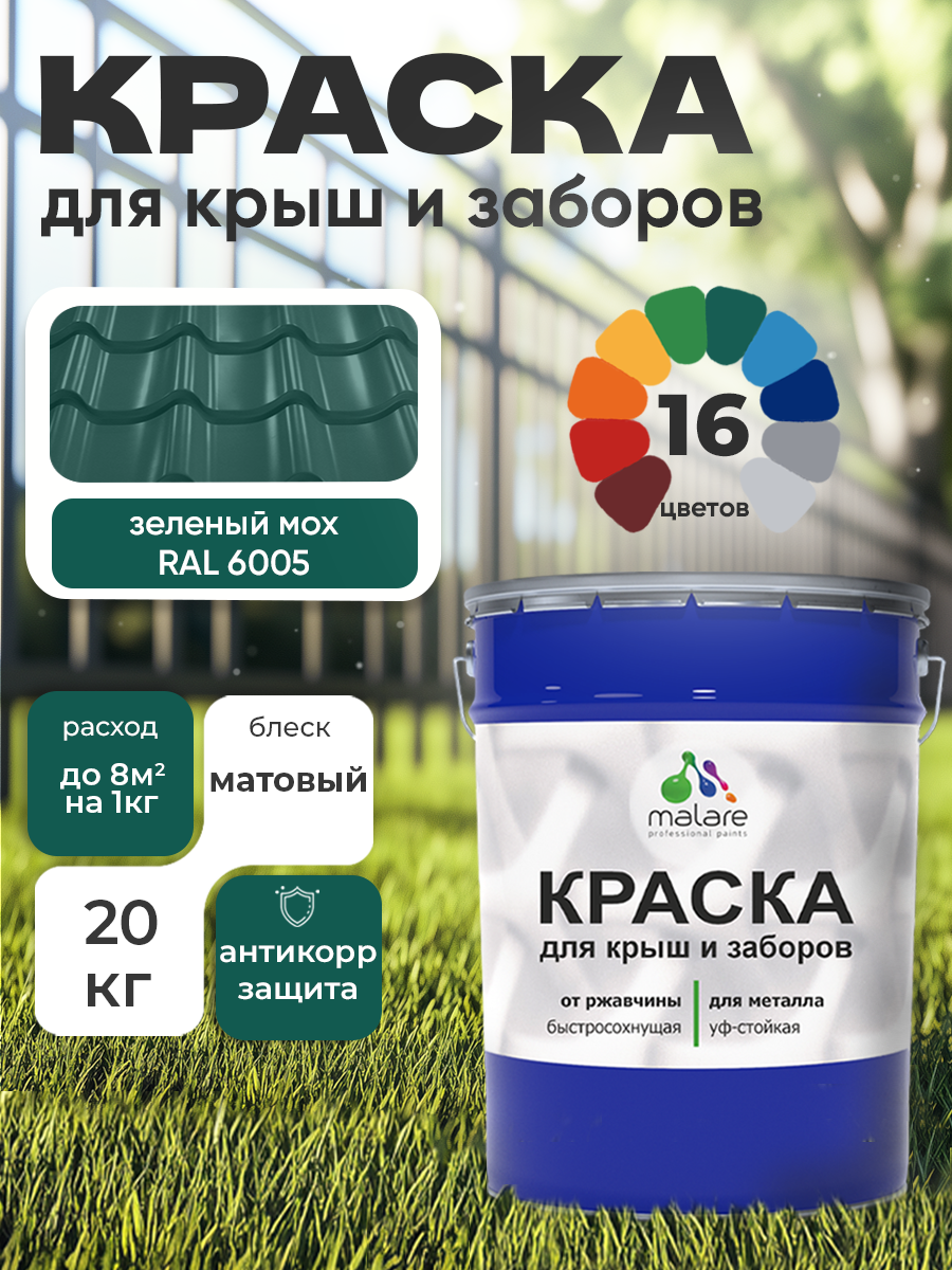 Купить Краска Malare для металлического забора, для крыши из металла, для металлочерепицы, антикоррозионная, матовый, зеленый мох, 20 кг.