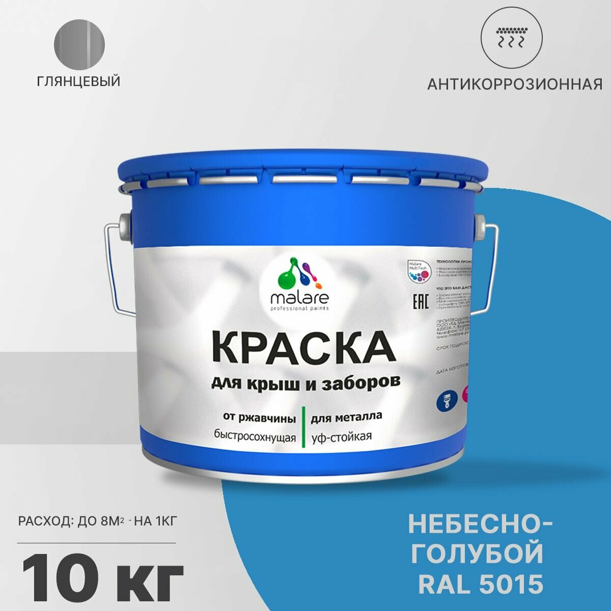 Купить Краска Malare для металлического забора, для крыши из металла, для металлочерепицы, антикоррозионная, глянцевый, небесно-голубой, 10 кг.