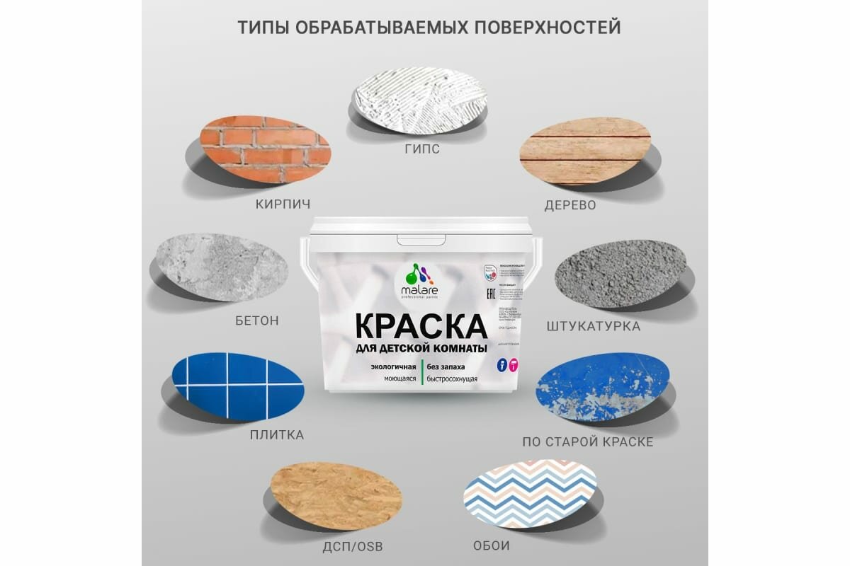 Краска Malare интерьерная для детской комнаты, для стен и обоев, для потолка, акриловая без запаха моющаяся матовая, аделаида (9л - 13кг)