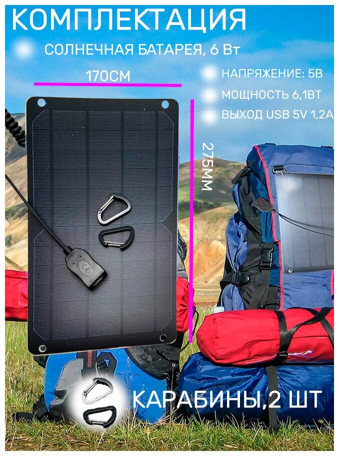 | Дополнительная информация | быстрое крепление на походный рюкзак или палатку с помощью двух карабинов; тип элементов монокристаллический |