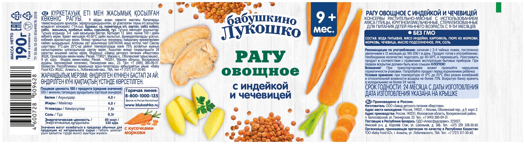 Пюре Бабушкино Лукошко Рагу овощное с индейкой и чечевицей, с 9 месяцев, 190 г, 6 шт.