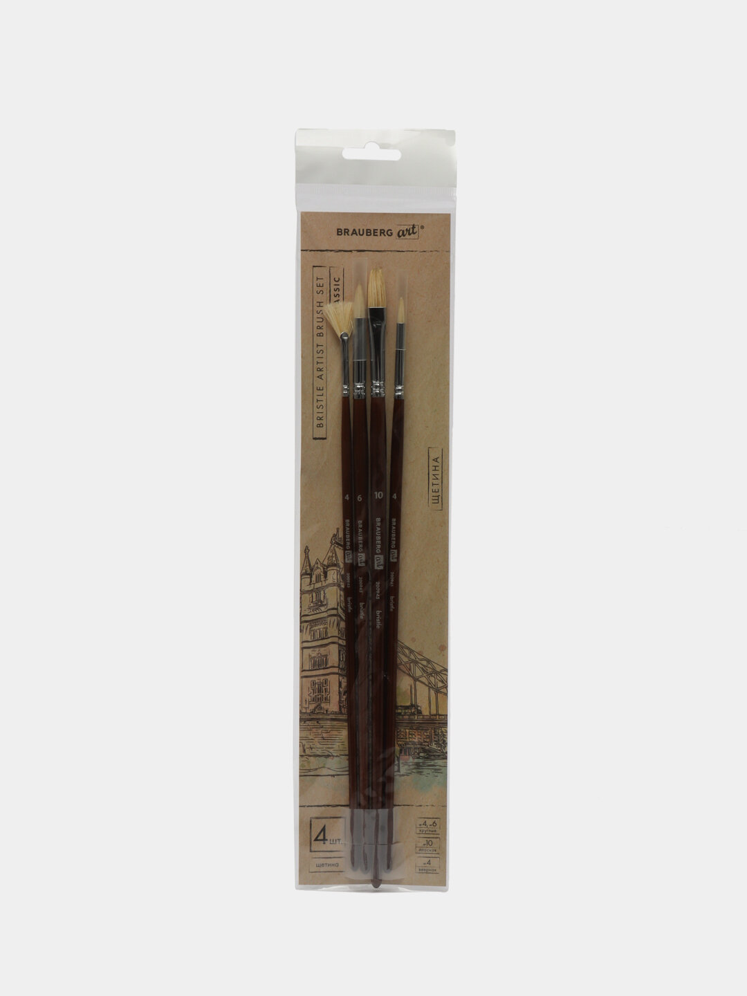Кисти художественные BRAUBERG ART, набор 4 шт. (щетина круглая № 4, 6, плоская № 10, веерная № 4), 200945 (арт. 200945)