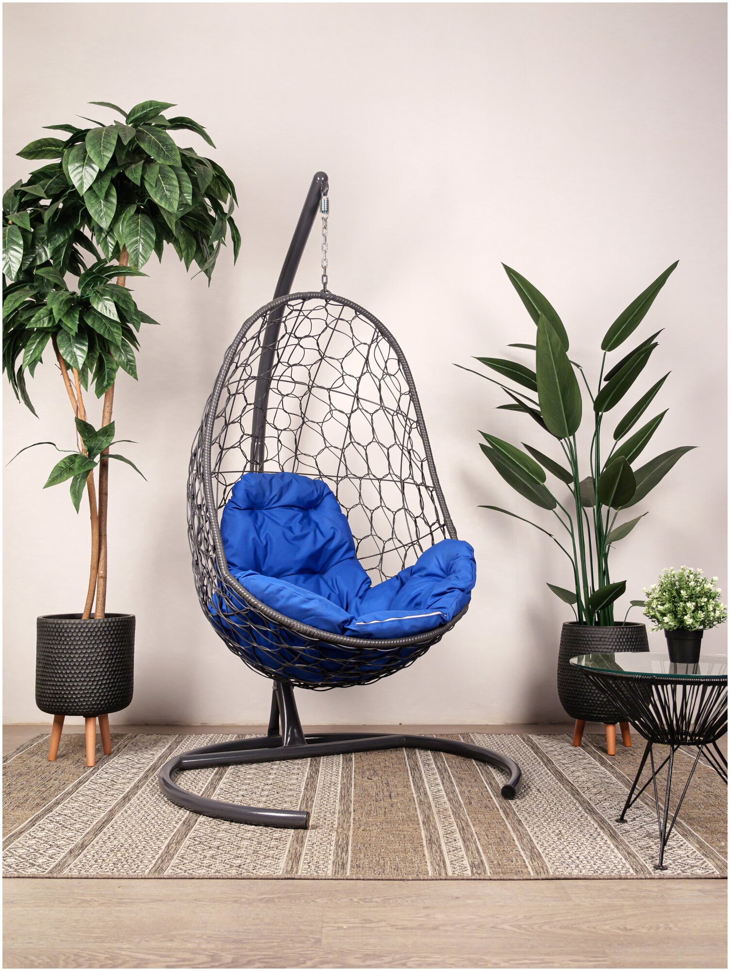 Купить Подвесное кресло овал с ротангом серое, синяя подушка