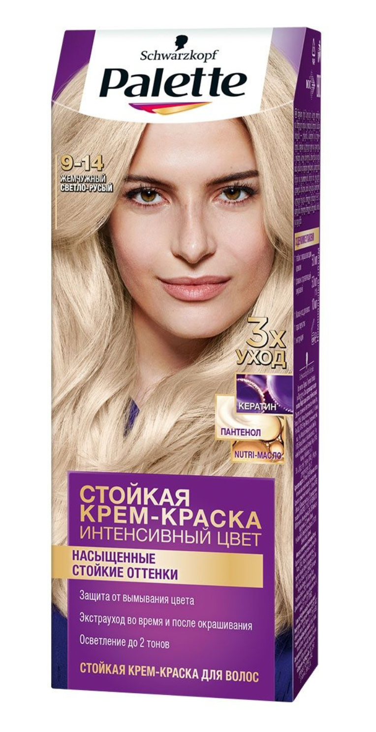 Ниже Вы можете прочитать отзывы на Крем краска стойкая для волос Palette, (9-14) Жемчужный светло-русый, защита от вымывания цвета, 110 мл, ознакомится с подробными характеристиками, посмотреть интересные обзоры и фотографии на Крем краска стойкая для волос Palette, (9-14) Жемчужный светло-русый, защита от вымывания цвета, 110 мл.