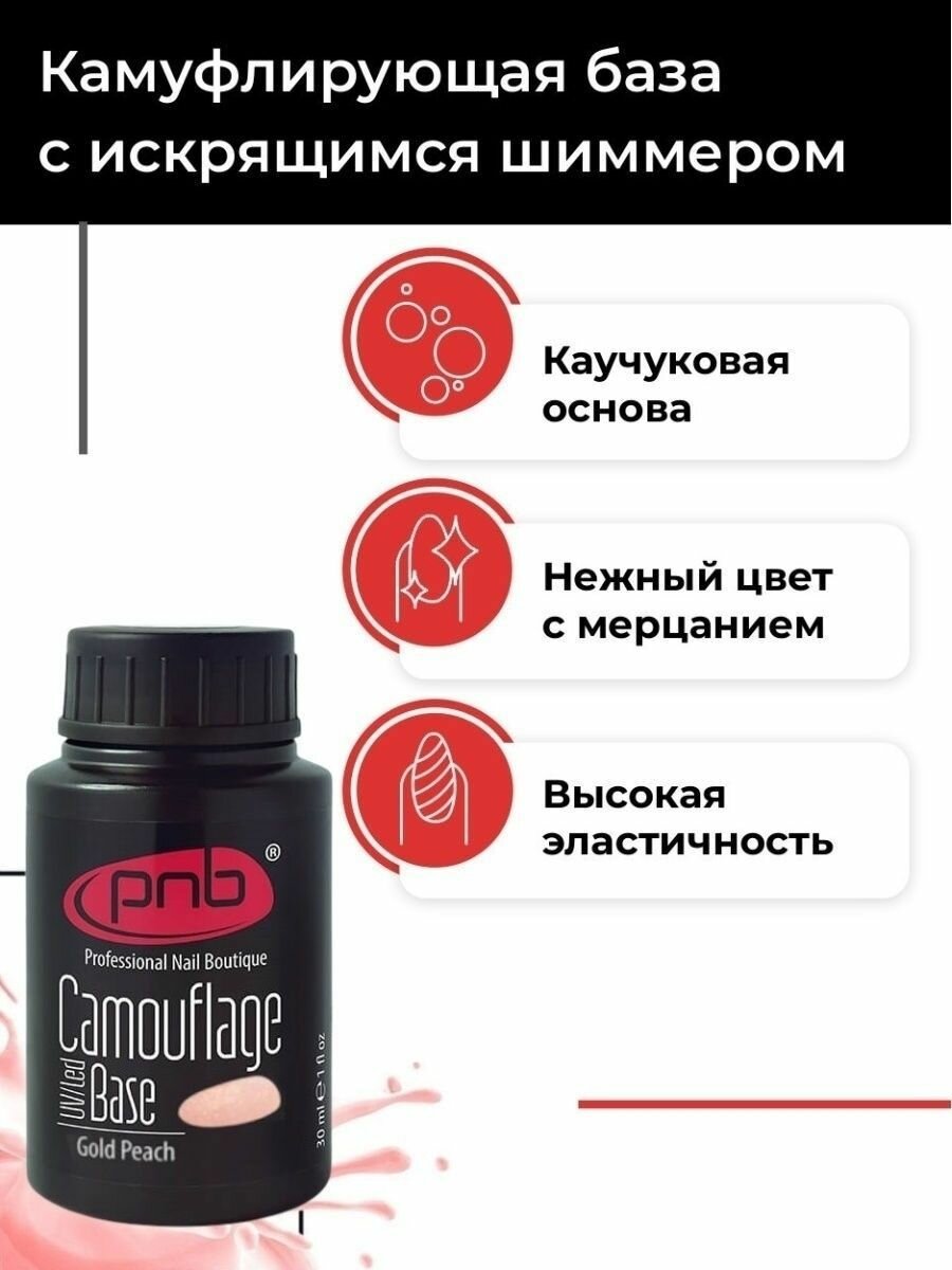 PNB Camouflage Base цветная камуфлирующая каучуковая база для ногтей и гель-лака с шиммером UV/LED золотисто-персиковая 30 мл