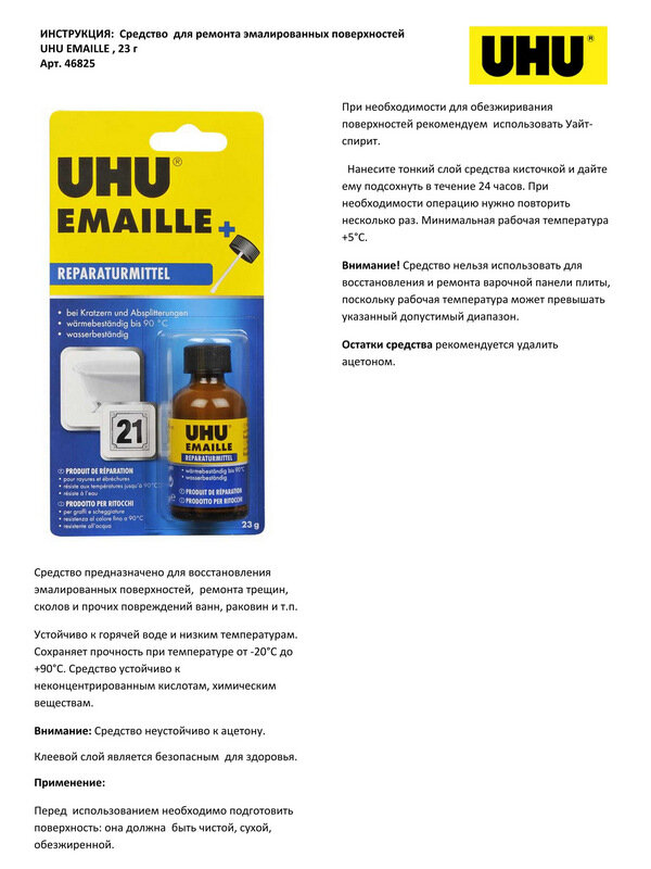 Ниже Вы можете прочитать отзывы на Клей для ремонта эмалированных поверхностей UHU Emaile, 23 г, блистер, ознакомится с подробными характеристиками, посмотреть интересные обзоры и фотографии на Клей для ремонта эмалированных поверхностей UHU Emaile, 23 г, блистер.