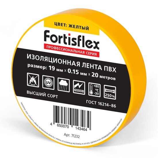 Изолента ПВХ FORTISFLEX 19 ммх0.15 ммх20 м желтая 71232