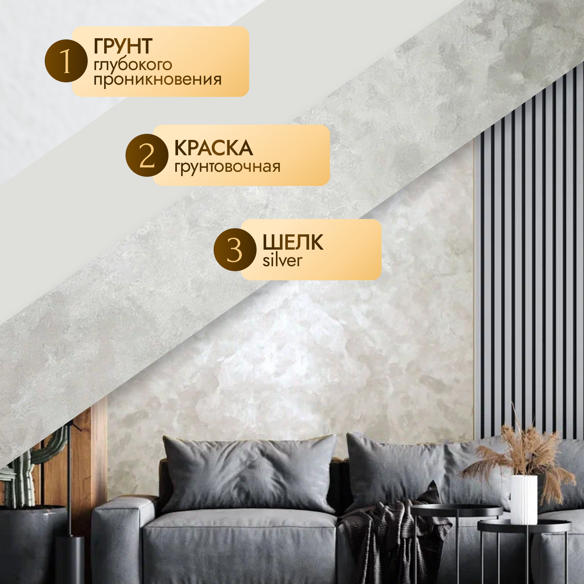 Краска, Декоративное покрытие ALINPRODUCT Шелк Сета Seta база серебро - перламутровая декоративная штукатурка для имитации мокрого шелка Акриловая, Фактурная, *Декоративная, Глянцевое покрытие, 3 кг, серебристый