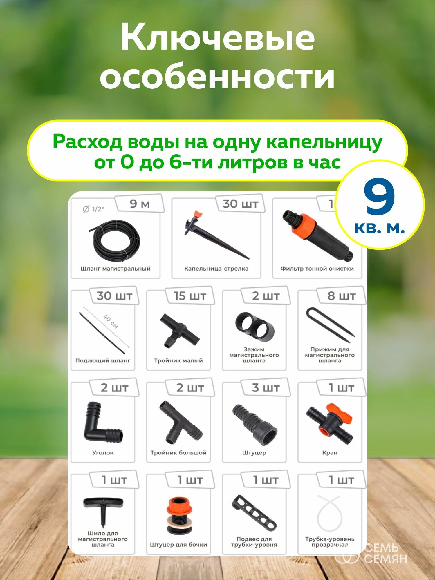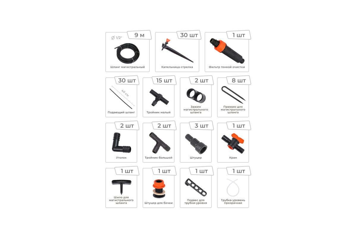 | Комплектация | штуцер присоединения к ёмкости - 1 шт.; шланг магистральный 9 м.; трубка уровень прозрачная 1 м.; подвес для трубки уровня -1 шт., шланг подающий 40см - 30 шт.; регулируемые капельницы для капельного полива - 30 шт.; тройник малый - 15 шт.; кран - 1 шт.; уголок для магистрального шланга - 2 шт.; тройник большой - 2 шт.; заглушка для магистрального шланга - 2 шт.; прижим для магистрального шланга -18 шт.; шило для магистрального шланга - 1 шт.; штуцер 1/2" ( для соединения с ёмкостью) - 1 шт.; штуцер 3/4(для монтажа фильтра) - 2 шт.; фильтр тонкой очистки - 1 шт.; инструкция по монтажу. |