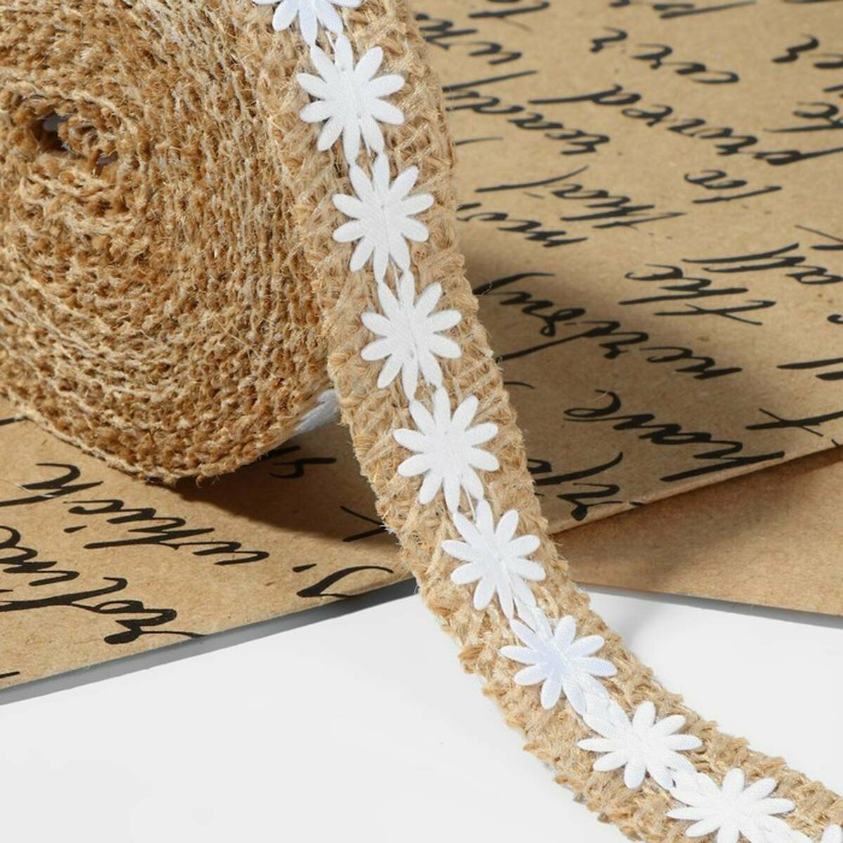 Лента из джута 'Ромашки', натуральная, 20 мм, 4,5 ± 0,5 м, цвет белый