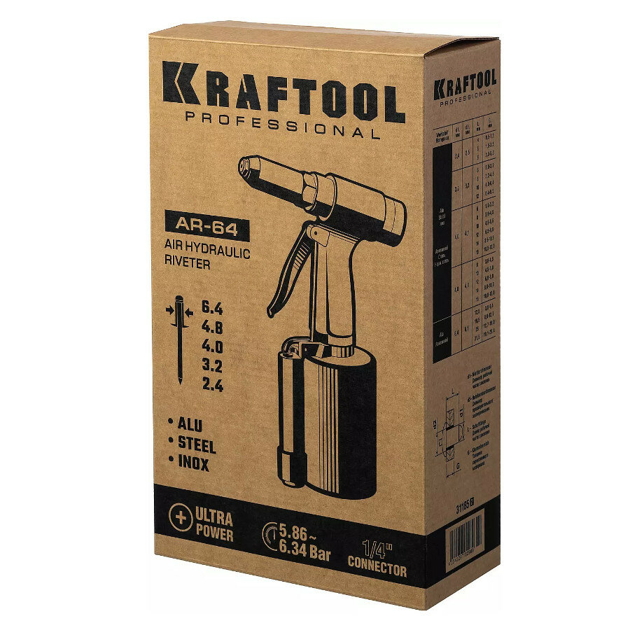 Kraftool Заклепочник пневматический KRAFTOOL AR-48 корпус из алюминия, для заклепок из нержавеющей стали, 2,4-3,2-4-4,8мм, 31184
