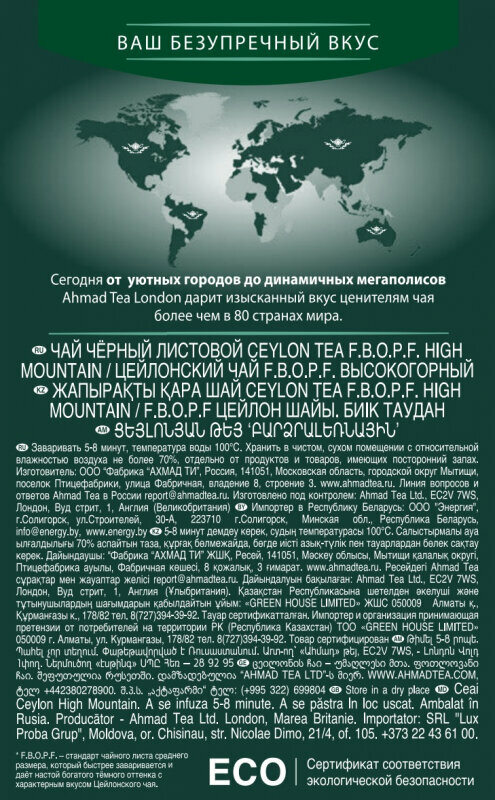 | Дополнительная информация | вкус: яркий характер высокогорного цейлонского чая. Настой этого чая так гармонично сочетает в себе мягкость вкуса чайных листьев невысоких гор С крепостью и ароматом чая высокогорных плантаций |