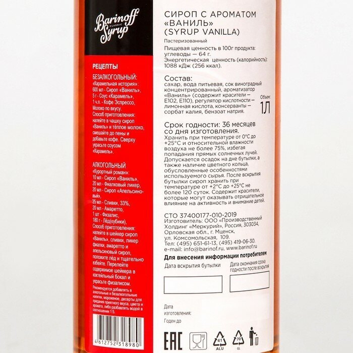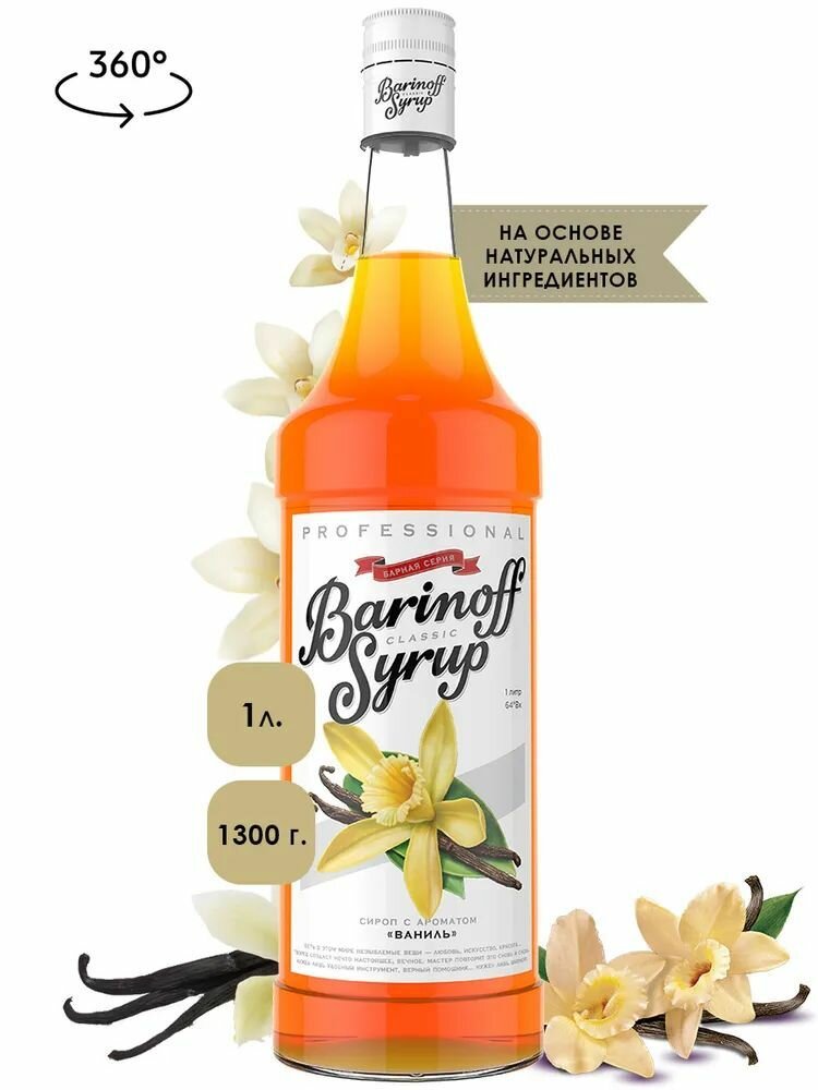 Сироп BARINOFF "Ваниль", 1 л, стеклянная бутылка В комплекте: 1шт.