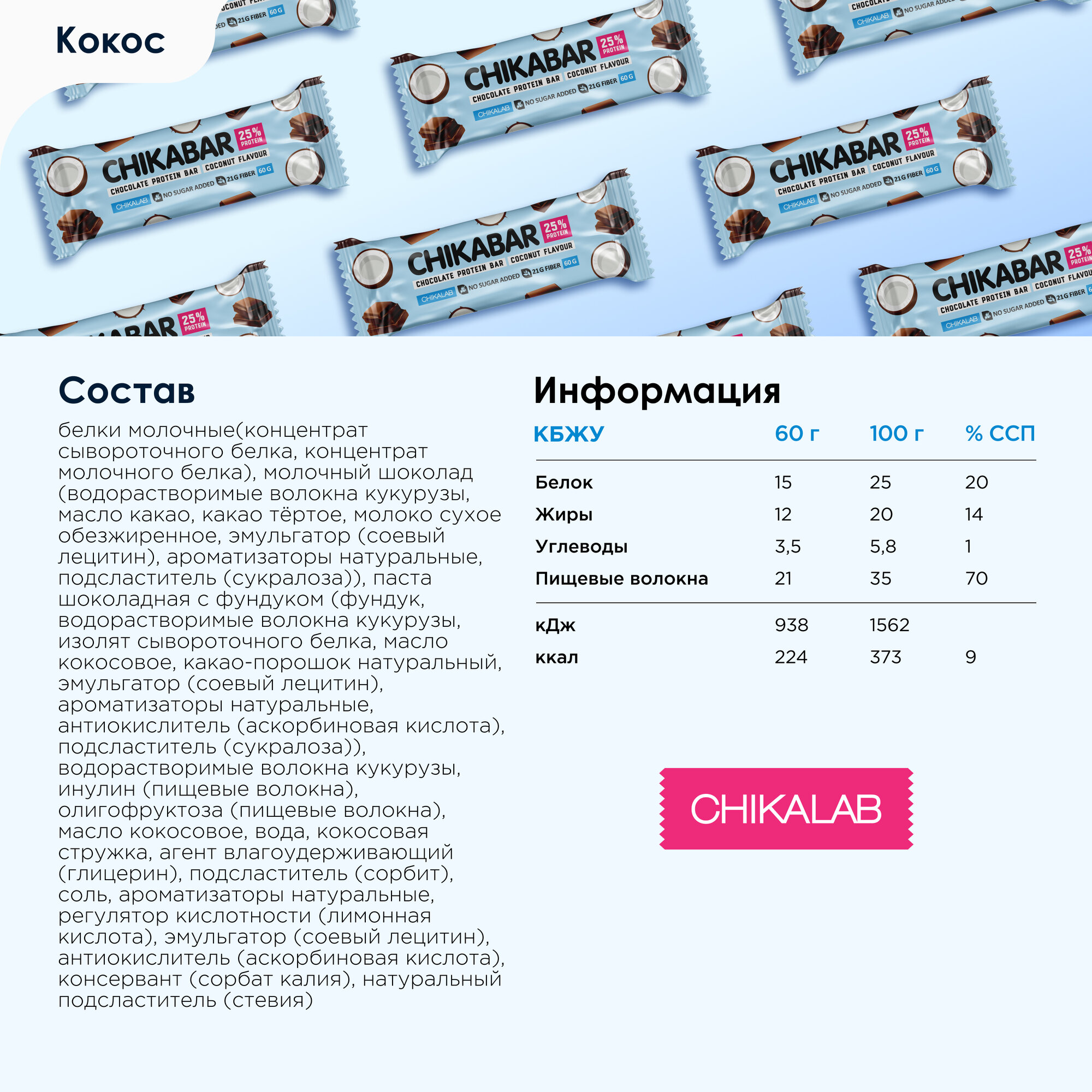 СохранитьПротеиновые батончики глазированный CHIKALAB CHIKABAR без сахара "Кокос - Шоколад", 12шт х 60г интересное: