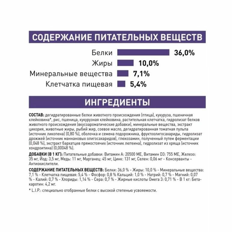 | Состав | дегидратированные белки животного происхождения (птица), кукуруза, пшеничная клейковина, рис, растительная клетчатка, кукурузная клейковина, гидролизат белков животного происхождения, пшеница, жом цикория, животные жиры, рыбий жир, минеральные вещества, соевое масло, фруктоолигосахариды, оболочка и семена подорожника, гидролизат дрожжей (источник маннановых олигосахаридов), гидролизат из панциря ракообразных (источник глюкозамина), экстракт бархатцев прямостоячих (источник лютеина), гидролизат из хряща (источник хондроитина) |