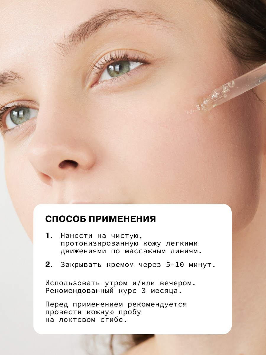 | Способ применения | Нанести на чистую, протонизированную кожу легкими движениями по массажным линиям. Закрывать кремом через 5–10 минут. Использовать утром и/или вечером. Рекомендованный курс 3 месяца. Перед применением рекомендуется провести кожную пробу на локтевом сгибе. |