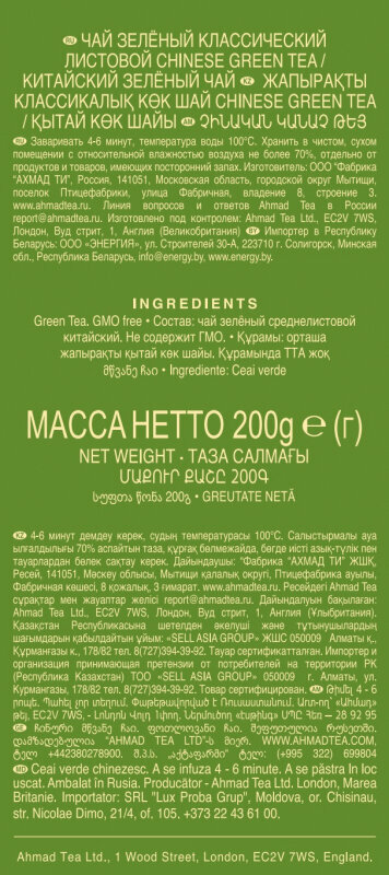 Чай "Ahmad Tea", Чай зеленый «Китайский», листовой, картон. коробка, 200г