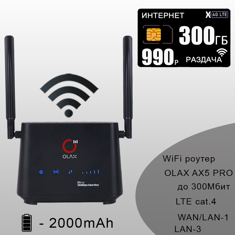 Купить Комплект I Wi-Fi роутер OLAX AX5 PRO с аккумулятором I Sim карта с интернетом и раздачей, 300ГБ за 990р/мес