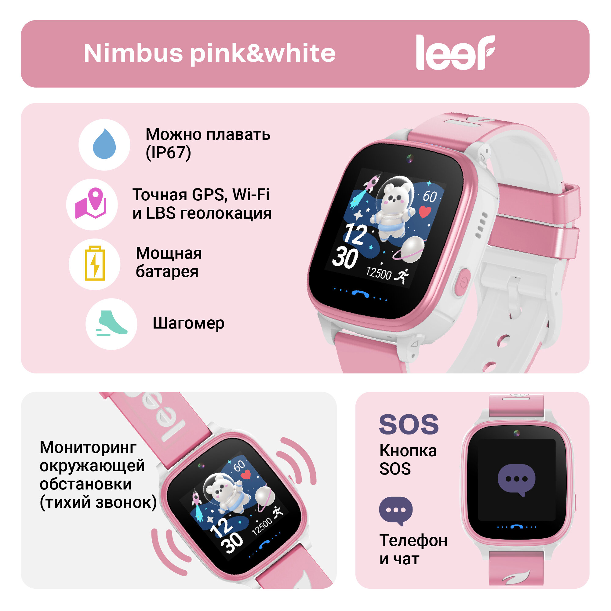 Детские умные GPS часы-телефон LEEF Nimbus / GPS, LBS и Wi-Fi геолокация/ прослушка/ водозащита - можно плавать/ цвет розовый+белый интересное:
