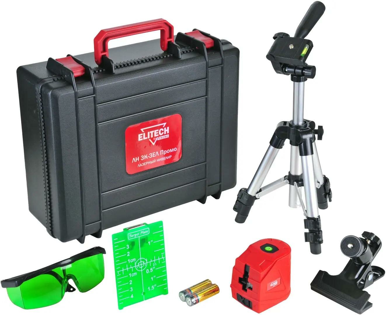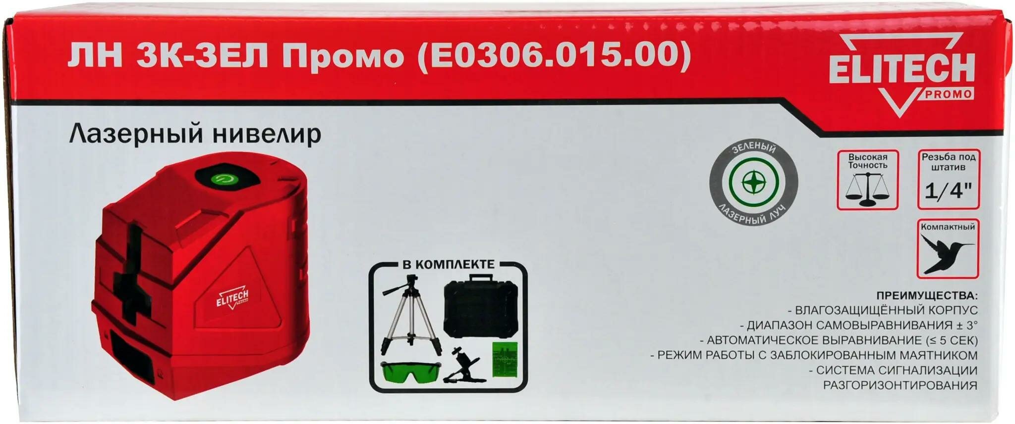 Лазерный нивелир Elitech ЛН 3К-ЗЕЛ Промо + набор кейс (зеленый) до 20м ± 0,3 мм/м гор/верт (Е0306.015.00)