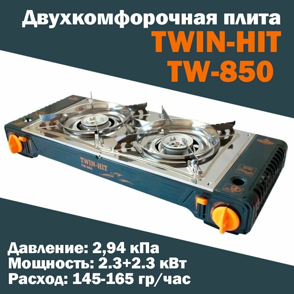 Плита газовая портативная TWIN-HIT (TW-850) - двухконфорочная с переходником, «Tourist»