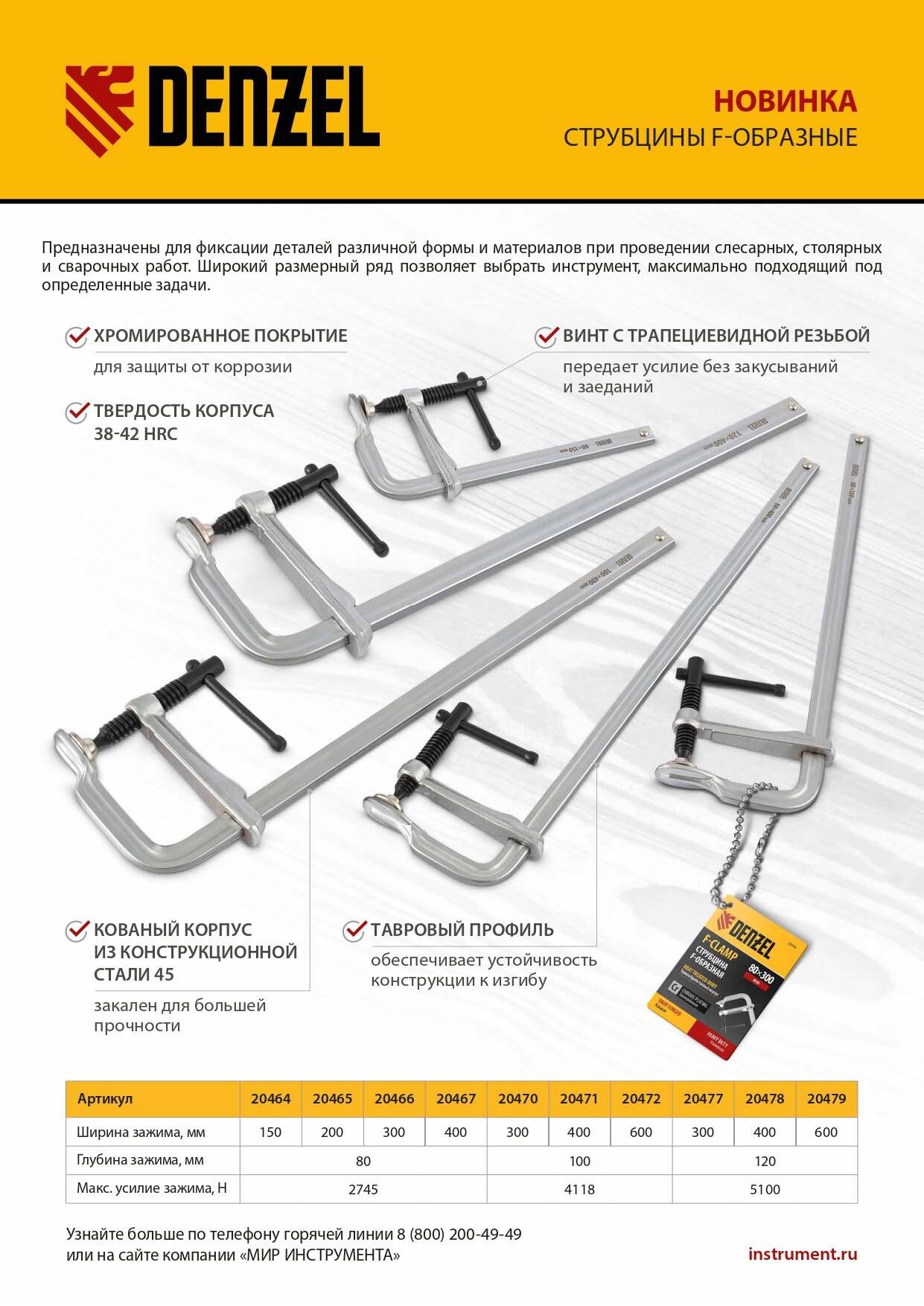 Ниже Вы можете прочитать отзывы на Струбцина F-образная Denzel 120x400мм, кованая 20478, ознакомится с подробными характеристиками, посмотреть интересные обзоры и фотографии на Струбцина F-образная Denzel 120x400мм, кованая 20478.