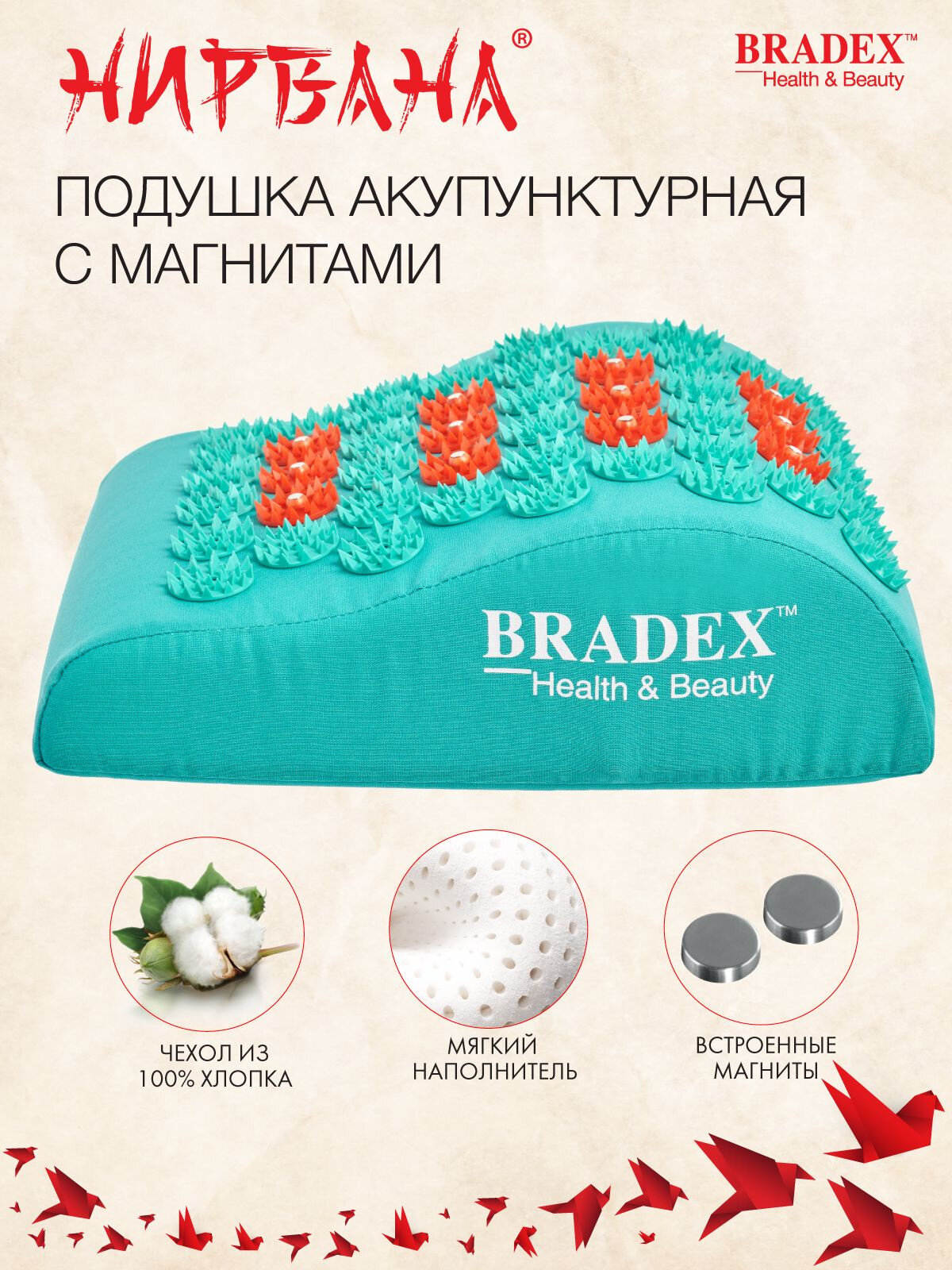 Массажная подушка BRADEX KZ 0838 нирвана с магнитами, для акупунктурного массажа зеленая