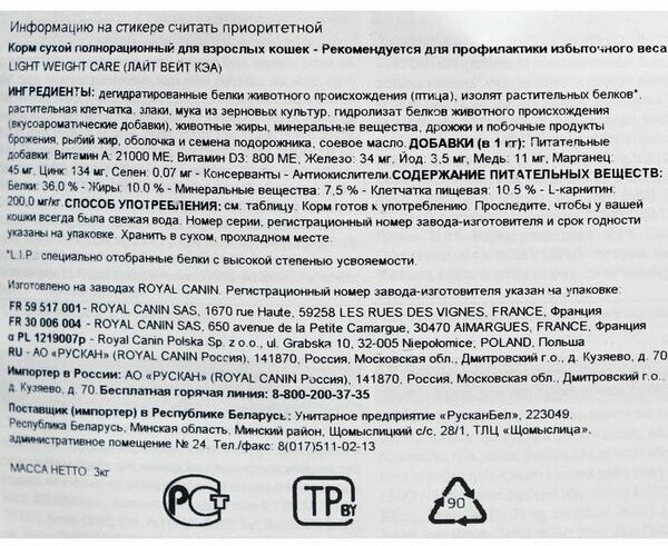 Royal Canin Light weight care (Лайт вейт кэа) корм для кошек склонных к полноте,а также после кастрации 3кг