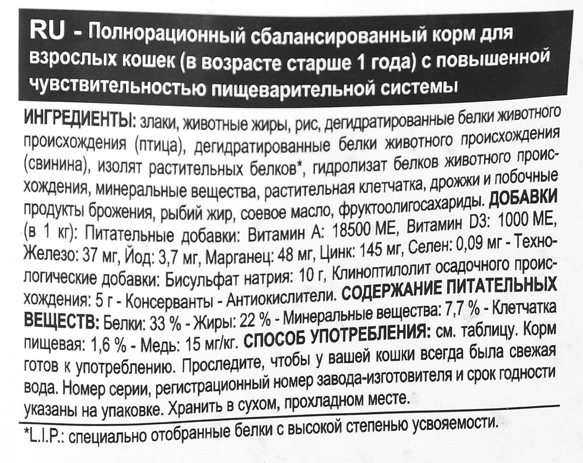 | Состав | животные жиры, рис, дегидратированные белки животного происхождения (птица), пшеница, дегидратированные белки животного происхождения (свинина), изолят растительных белков, мука из зерновых культур, гидролизат белков животного происхождения (вкусоароматические добавки), минеральные вещества, растительная клетчатка, дрожжи и побочные продукты брожения, рыбий жир, соевое масло, фруктоолигосахариды |