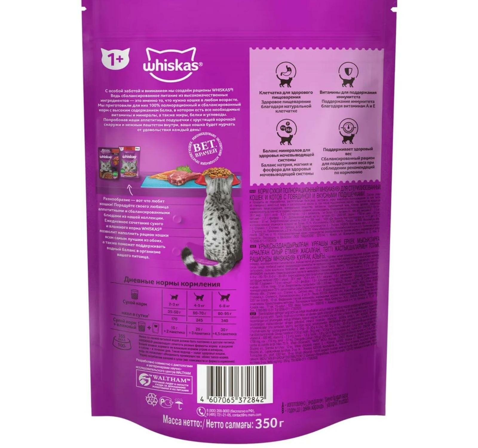 Whiskas корм для взрослых стерилизованных кошек всех пород, подушечки с говядиной 350 гр