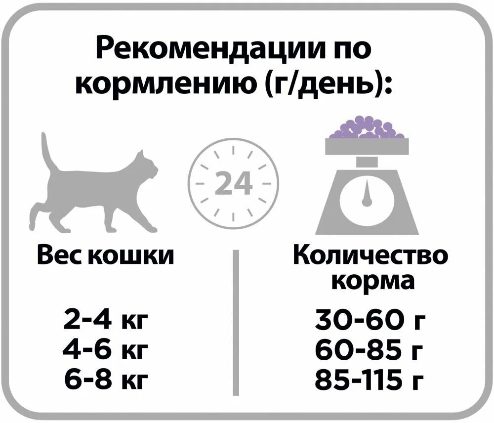 | Дополнительная информация | Рекомендации по кормлению, позволяющие поддерживать идеальную форму могут варьироваться в зависимости от возраста животного, его активности и условий окружающей среды. Следите за весом Вашей кошки и корректируйте количество даваемого корма. Следите, чтобы у Вашей кошки всегда была чистая, свежая питьевая вода. Для здоровья Вашей кошки регулярно консультируйтесь с ветеринарным врачом. |