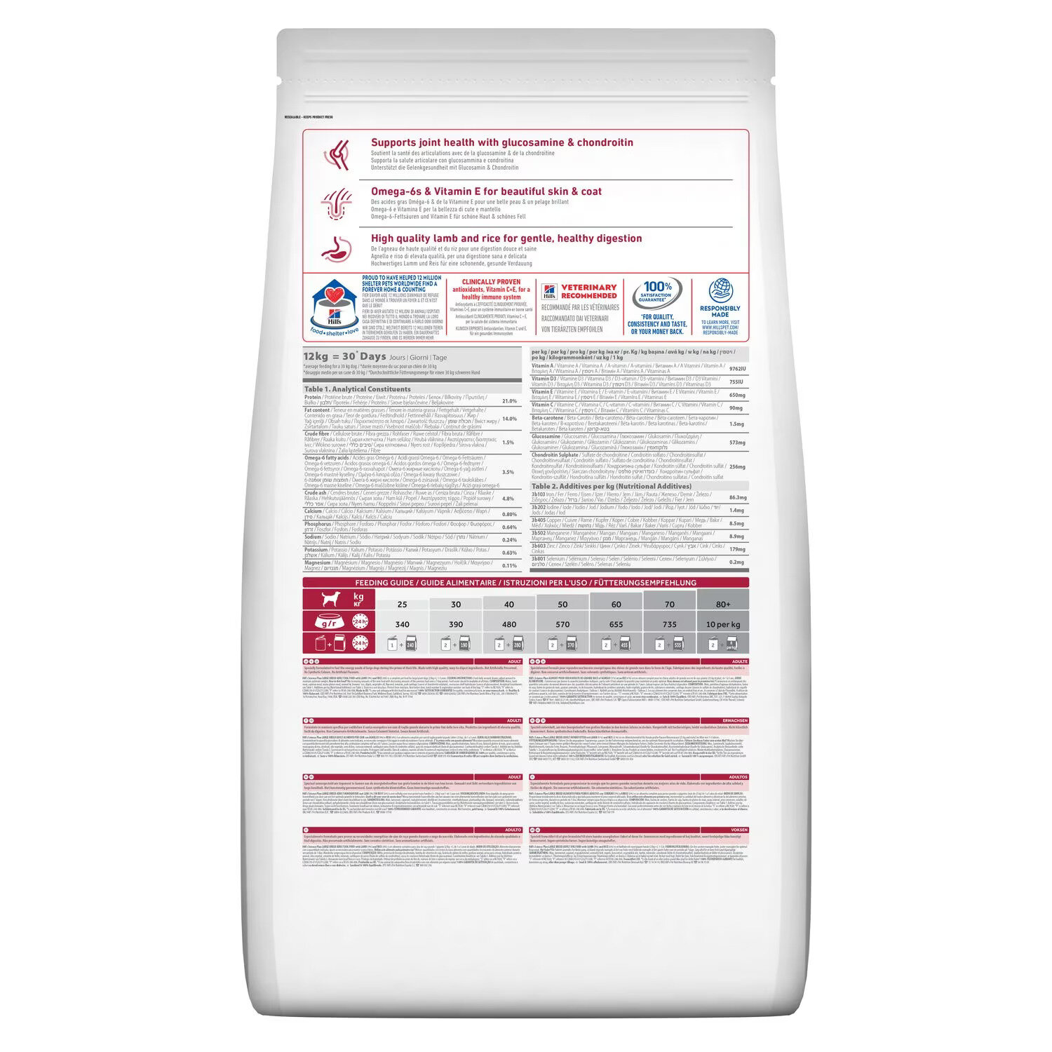 | Состав | кукуруза, мука из ягненка (ягненок 9%), мука из соевых бобов, мука из кукурузного глютена, животный жир, размолотый рис (рис 6%), гидролизат белка, растительное масло, семя льна, минералы, свиной хрящ (источник хондроитина сульфата), гидролизат панцирей ракообразных (источник глюкозамина) |