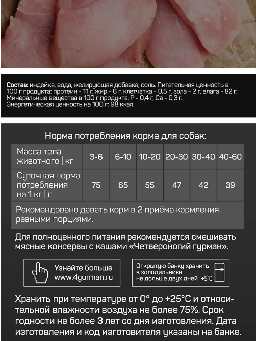 Четвероногий Гурман влажный корм для взрослых собак всех пород, индейка натуральная в желе 100 гр